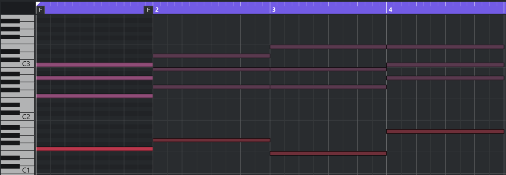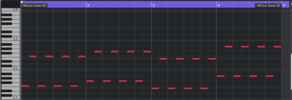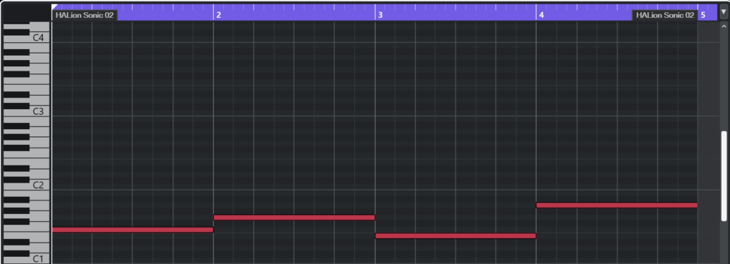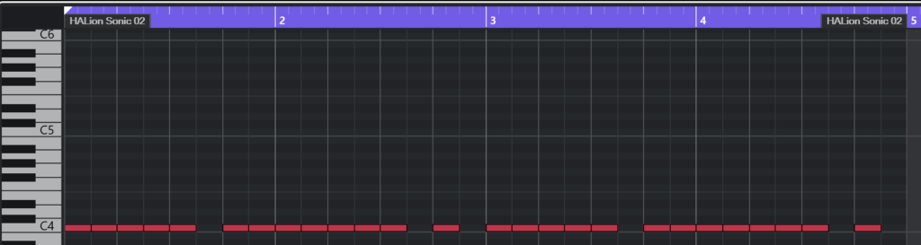 鍵盤のC1〜C2の間で、1小節ずつ「ファ」「ソ」「ミ」「ラ」と本の通りに打ち込み、できたら一度再生してみます(画像2-1)。