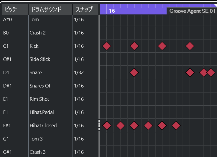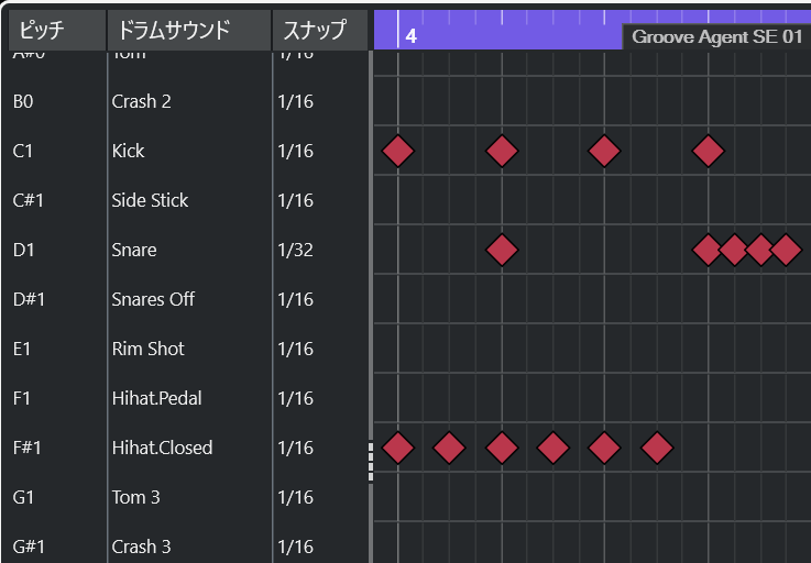 動画の通りに打ち込むと基礎的なドラムパターンが出来上がりました。