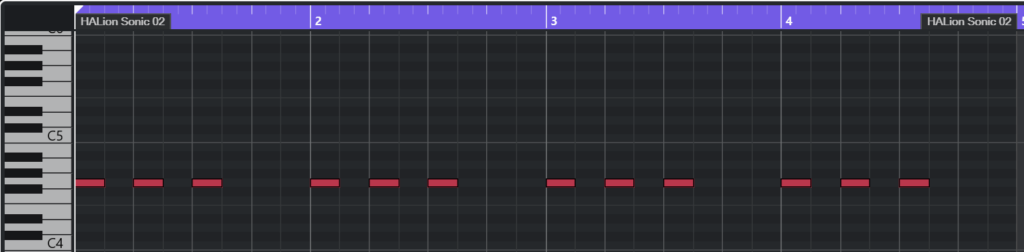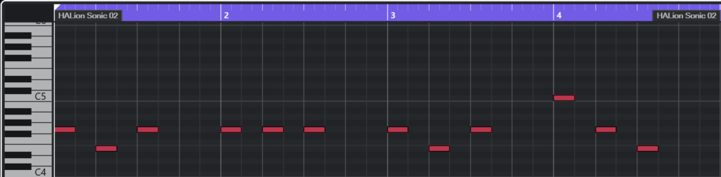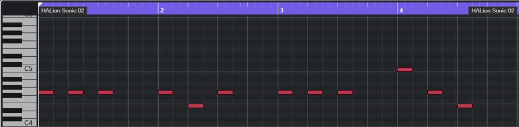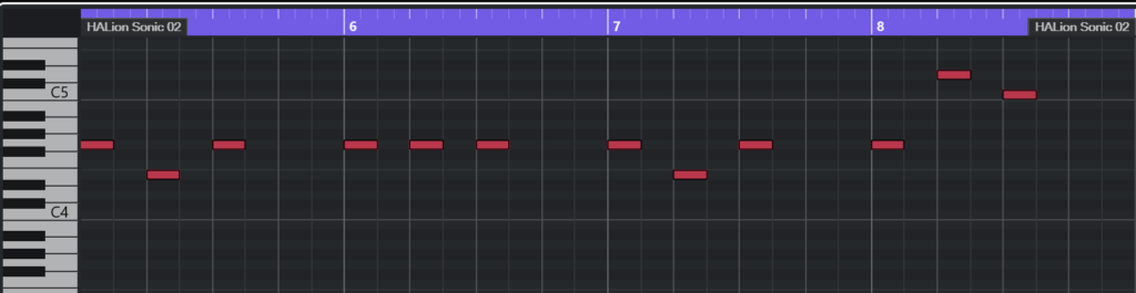 できたものを見ると、前半2小節と後半2小節のそれぞれ最初の5拍までは同じ打ち方ですが、続く3拍で音の高さに変化がつけられています。